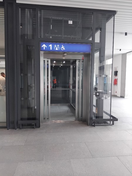 Výtahy (automaticky otevírané dveře šířka 130 cm; kabina šířka 130 cm, hloubka 240 cm) spojují úroveň vestibulu a nástupiště. Manipulační prostor před výtahy je dostatečný. Kabiny jsou vybavené madly (výška 92 cm) na čelní a boční stěně. Zrcadlo v kleci není. Ovladač na nástupních místech je ve výšce max. 106 cm, maximální výška ovladačů uvnitř kabin je 109 cm.