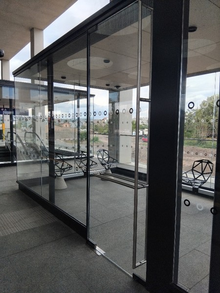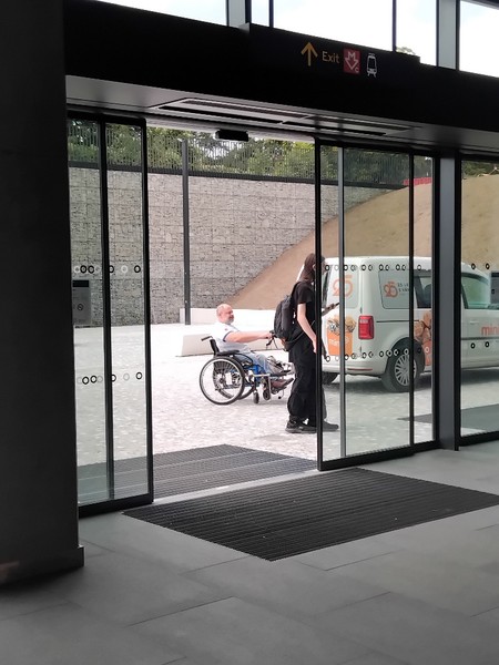 Do nádražní haly vedou dvoukřídlé dveře, které se otevírají automaticky směrem do stran. Šířka průchodu je dostatečná (min. 100 cm).