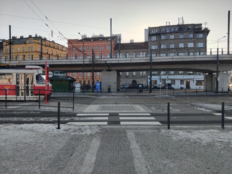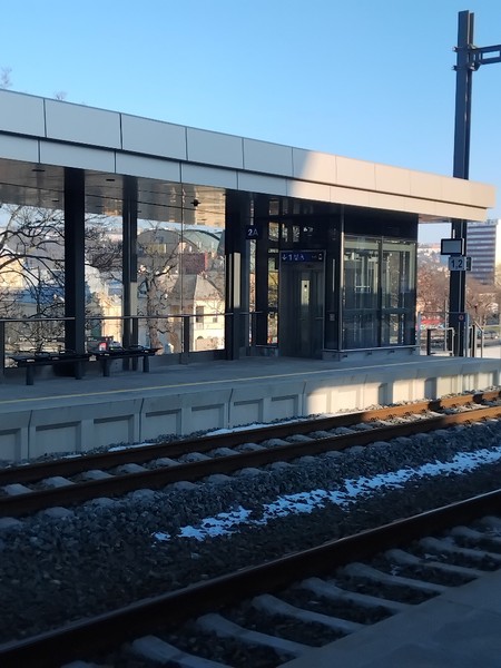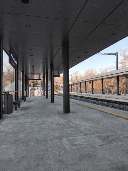 Protilehlá zastřešená nástupiště s rovnou velkoformátovou dlažbou jsou široká min. 200 cm. Výška nástupní hrany je min. 55 cm.