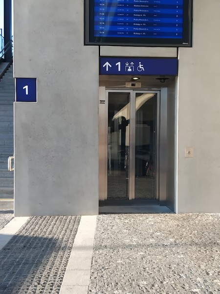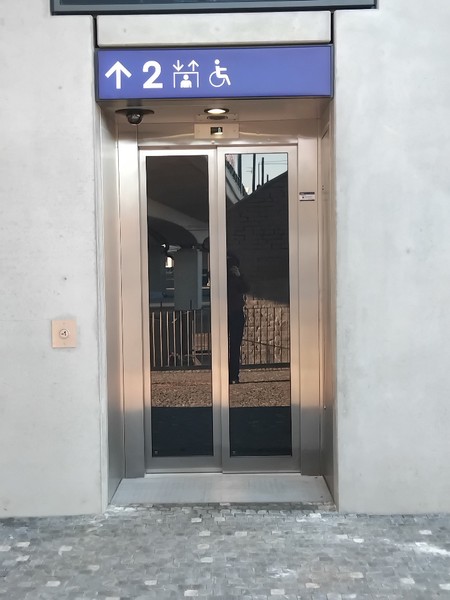 Průchozí výtahy (automaticky otevírané dveře šířka 100 cm; kabina šířka 103 cm, hloubka 230 cm) spojují uliční úroveň a nástupiště. Manipulační prostor před výtahy je dostatečný, ale plocha je ve sklonu (2,5 %). Kabiny jsou vybavené madly (výška 96 cm) na boční stěně. Zrcadlo v kleci není. Ovladač na nástupních místech je ve výšce max. 102 cm, maximální výška ovladačů uvnitř kabin je 122 cm.