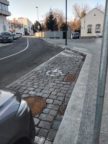 V ulici Strojnická v blízkosti výtahů je jedno vyhrazené stání. Má povrch z hrubé kamenné dlažby, nedostatečnou šířku, podélný sklon (až 7 %) a chybí u něj nájezd na chodník.