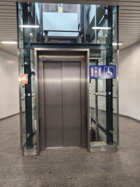Výtahy propojující jednotlivá nástupiště na společný podchod (automaticky otevírané dveře šířka 90 cm; kabina šířka 105 cm, hloubka 210 cm) jsou volně přístupné. Manipulační prostor před výtahy je dostatečný. Kabiny jsou vždy vybavené madlem na boční stěně a zrcadlem (spodní hrana výška 55 cm) na čelní stěně. Sklopné sedátko je vždy v dosahu ovladače. Ovladač na nástupních místech je ve výšce max. 101 cm, maximální výška ovladačů uvnitř kabin je 102 cm.