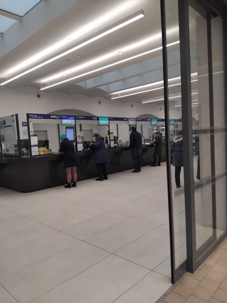 Odbavovací prostor pro cestující (spodní nádražní hala) s prodejnou jízdenek (pult snížená výška 84 cm) a čekárnou je zapuštěn pod kolejištěm, v úrovni podchodu a ulice. Cestujícím je k dispozici rovněž horní nádražní hala (v úrovni kolejiště), kde je hygienické zázemí s přístupnou kabinou WC (viz WC) a další vybavenost (prodejny, kavárna). Spodní a horní nádražní halu propojuje dvojice výtahů (viz Výtah). Všechny průchody jsou široké min. 80 cm. Manipulační prostor je dostatečný.