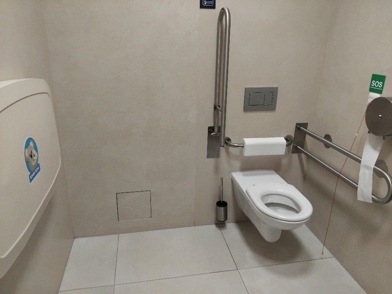 Přístupná kabina WC (dveře šířka 92 cm; kabina šířka 186 cm, hloubka 228 cm) je samostatná a nachází se v horní nádražní hale. Jednokřídlé dveře do WC jsou označené a otevírají se mechanicky směrem ven. Přístup k míse z pohledu od vstupu do kabiny je zleva. Prostor pro vozík vedle WC mísy je dostatečný (šířka 121 cm). Toaletní mísa je vybavena jedním sklopným a jedním pevným madlem. Kabina WC se uzamyká na Euroklíč.