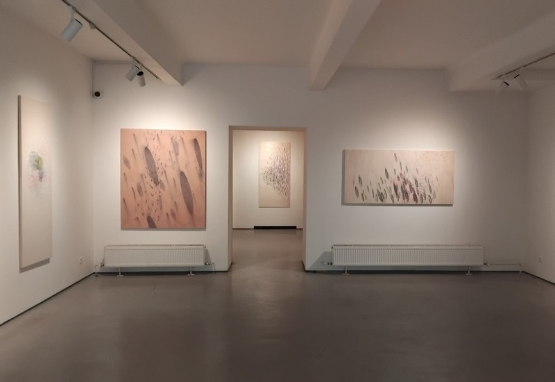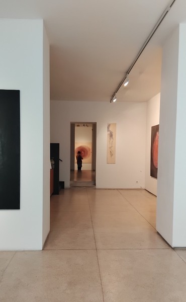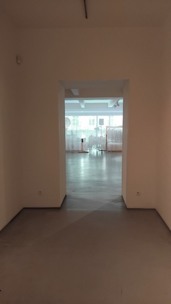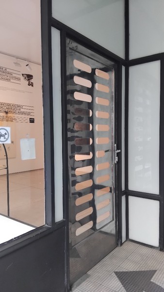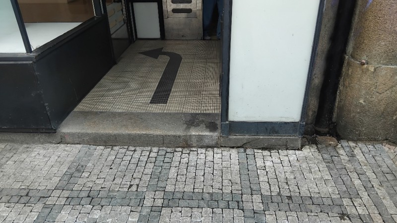 Za vstupem je pokladna (pult výška 83 cm), od níž vedou do výstavních prostor nejprve +2 schody, pak -4 schody.
