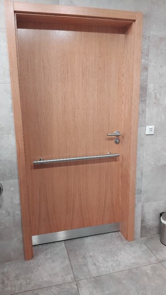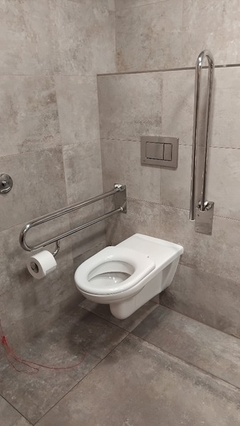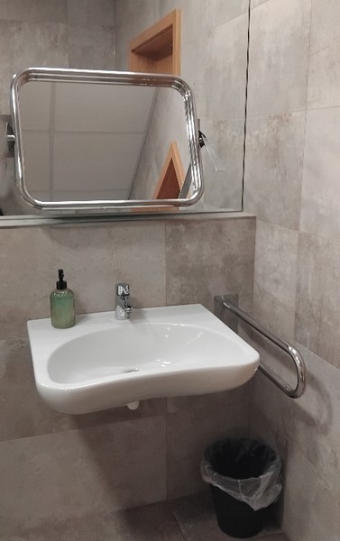 Upravená kabina WC (dveře šířka 80 cm; kabina šířka 230 cm, hloubka 220 cm) je součástí kavárny. Jednokřídlé dveře do WC jsou označené a otevírají se mechanicky směrem ven. Přístup k míse z pohledu od vstupu do kabiny je zprava. Prostor pro vozík vedle WC mísy (šířka 172 cm) je dostatený. Toaletní mísa je vybavena jedním sklopným a jedním pevným madlem.