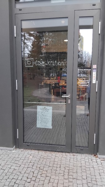 Kavárna ma samostatný vstup z východní strany. Dvoukřídlé dveře (hlavní křídlo šířka 90 cm, vedlejší křídlo šířka 40 cm) se otevírají mechanicky směrem ven.