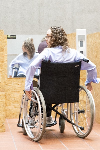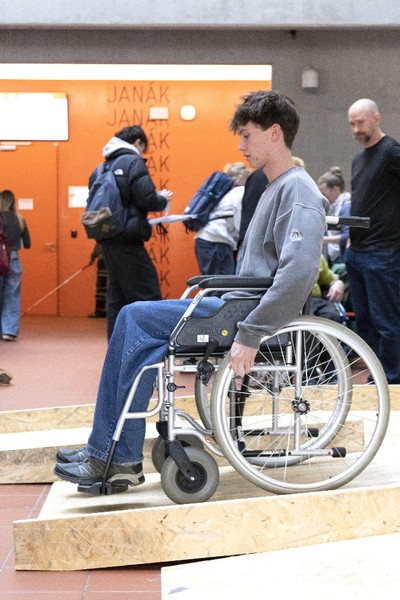 Během konání výstavy si studenti mohli vyzkoušet v simulovaném prostředí různé kompenzační pomůcky.