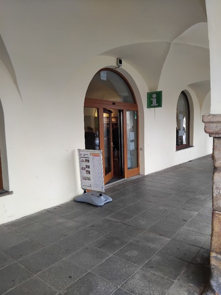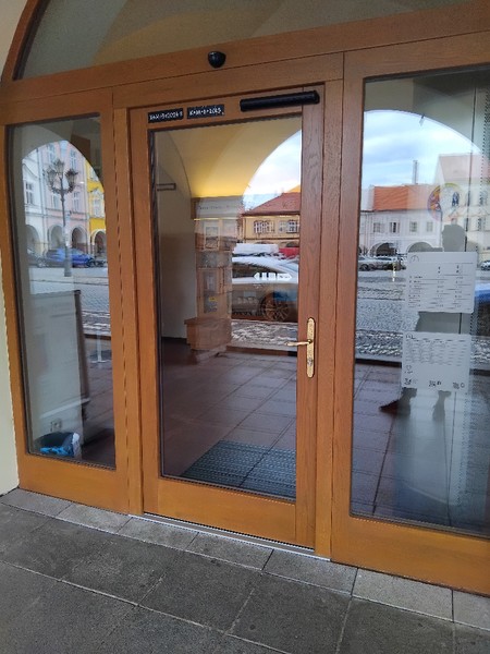 Přístupový chodník má povrch z mozaikové a velkoformátové dlažby bez větších poruch. Jednokřídlé dveře infocentra (šířka 95 cm) se otevírají mechanicky směrem dovnitř.