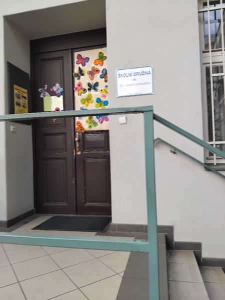 Školní družina se nachází v jiné budově na adrese Truhlářská 1116/14. Od budovy školy k ní vede chodník převážně s mozaikovou dlažbou, místy přerušený vjezdem s nerovným povrchem z hrubých kostek. Hrubá kamenná dlažba je rovněž ve dvoře, ve kterém se nacházejí vstupy do družiny. Budova s družinou je bariérová. Ve vstupech na oddělení jsou schodiště (min. +4 schody). Zvonková signalizace je ve výšce 137 cm.