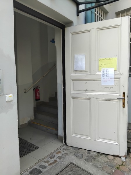 Budova se nachází v historickém centru Prahy, v okolí se často vyskytuje hrubá kamenná dlažba. Chodník před budovou má povrch z rovné mozaikové dlažby. Hlavní vstup je bariérový. Před vstupními dveřmi je +1 schod (výška 6 cm). Dvoukřídlé dveře (šířka 2x 90 cm) se otevírají mechanicky směrem dovnitř. Špatně dostupná zvonková signalizace (výška 157 cm) je až v zádveří (šířka 365 cm, hloubka 289 cm). Ze zádveří vedou do interiéru další dvoukřídlé dveře (šířka 2x 84 cm), za nimiž je schodiště (+8 schodů do zvýšeného přízemí) a druhé schody (+7 schodů) k vrátnici.