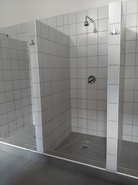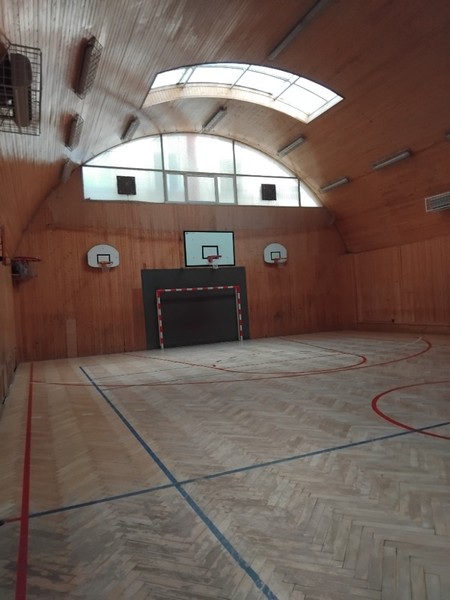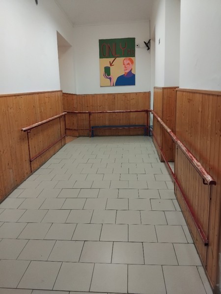 Ve zvýšeném přízemí se kromě šaten nachází počítačové učebny, jídelna a velká tělocvična. K tělocvičně vede chodba ve sklonu (sklon max. 16 %), hygienické zázemí se sprchami je pouze běžné.