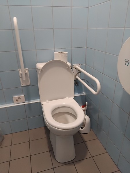 Částečně přístupná toaleta (dveře šířka 80 cm; kabina šířka 140 cm, hloubka 276 cm) je samostatná a nachází se ve 3. patře. Jednokřídlé dveře do WC nejsou označené, otevírají se mechanicky směrem ven. Přístup k míse z pohledu od vstupu do kabiny je zleva. Prostor pro vozík vedle WC mísy je mírně zúžený (šířka 77 cm). Toaletní mísa je vybavena jedním sklopným a jedním pevným madlem.