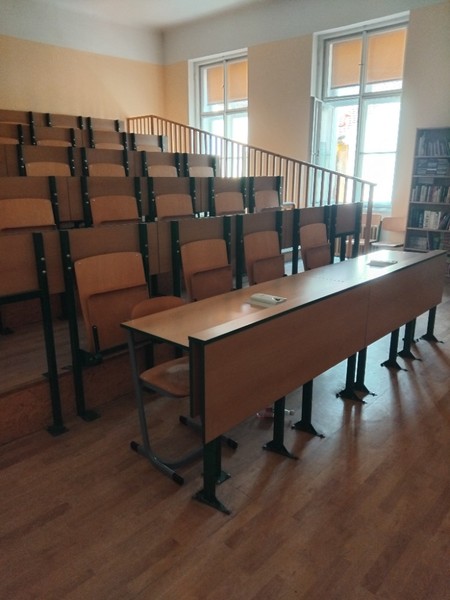 Stupňovitě řešená aula ve 2. patře má vyhrazené místo v přední části.