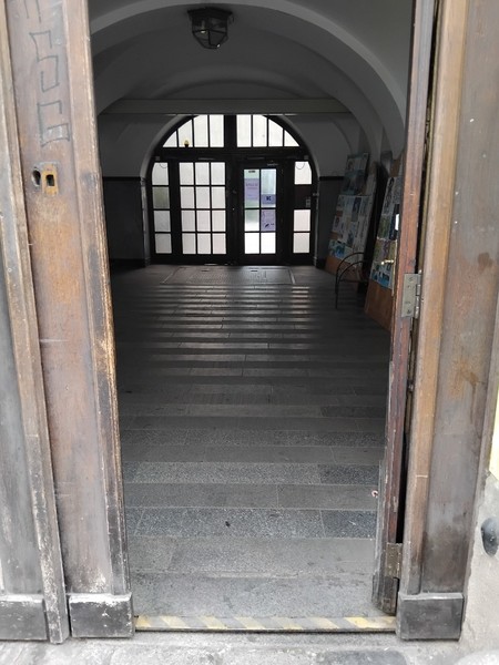 Na vchod navazuje domovní průchod v mírném podélném sklonu (do 4 %) s rovnou velkoformátovou dlažbou. Z průchodu na vnitřní dvůr vedou opět dvoukřídlá vrata (šířka 2x 100 cm) se vsazenými dveřmi (šířka 85 cm) s nižší prahovou lištou (výška 2 cm), otevírají se mechanicky směrem do průjezdu. Za dveřmi ve dvoře je +1 schod (výška 8 cm), na nějž navazuje prudká rampa (sklon 18 %, šířka 242 cm, délka 194 cm) bez madla. Plocha dvora je v rovná dlážděná velkoformátovou dlažbou s širokými spárami (šířka 1,5 cm).