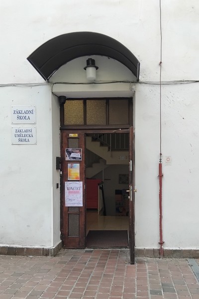 Ze dvora vede vstup do budovy školy. Dvoukřídlé dveře (hlavní křídlo šířka 78 cm, vedlejší křídlo šířka 39 cm) s prahem (výška 2 cm) se otevírají mechanicky směrem ven. Zvonková signalizace (výška 154 cm) a čipová čtečka (výška 121 cm) je vlevo u dveří.
