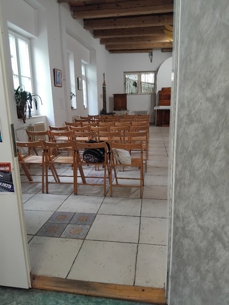 V přízemí školy v úrovni vstupu se nachází pouze sekretariát (dveře šířka 80 cm, práh výška 2 cm) a kaple (dveře šířka 2x 90 cm, práh výška 2 cm), která se zároveň využívá jako aula.