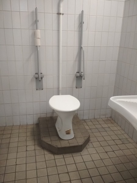 Upravená kabina (dveře šířka 80 cm; kabina šířka 180 cm, hloubka 160 cm) je součástí oddělení WC ženy. Neoznačené jednokřídlé dveře kabiny se otevírají mechanicky směrem ven. Přístup k míse, která je kotvená na střed kabiny, je omezený soklem (výška 10 cm), místo vedle WC mísy je zúžené (šížka 60 cm). WC mísa je vybavena dvěma sklopnými madly.