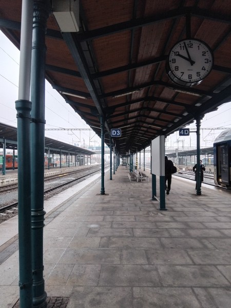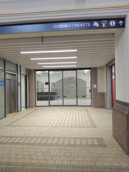 Odbavovací prostor pro cestující (spodní nádražní hala) s prodejnou jízdenek (pult snížená výška 84 cm) a čekárnou je zapuštěn pod kolejištěm, v úrovni podchodu a ulice. Cestujícím je k dispozici rovněž horní nádražní hala (v úrovni kolejiště), kde je hygienické zázemí s přístupnou kabinou WC (viz WC) a další vybavenost (prodejny, kavárna). Spodní a horní nádražní halu propojuje dvojice výtahů (viz Výtah). Všechny průchody jsou široké min. 80 cm. Manipulační prostor je dostatečný.