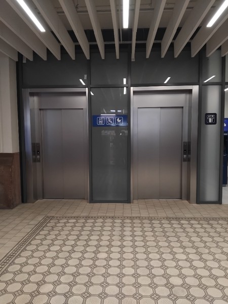 Dvojice výtahů propojující spodní a horní nádražní halu (automaticky otevírané dveře šířka 100 cm; kabina šířka 126 cm, hloubka 210 cm) je volně přístupná. Manipulační prostor před výtahy je dostatečný. Kabiny jsou vždy vybavené madlem a zrcadlem (spodní hrana výška 1 cm) na čelní stěně. Sklopné sedátko není k dispozici. Ovladač na nástupních místech je ve výšce max. 104 cm, maximální výška ovladačů uvnitř kabin je 126 cm.