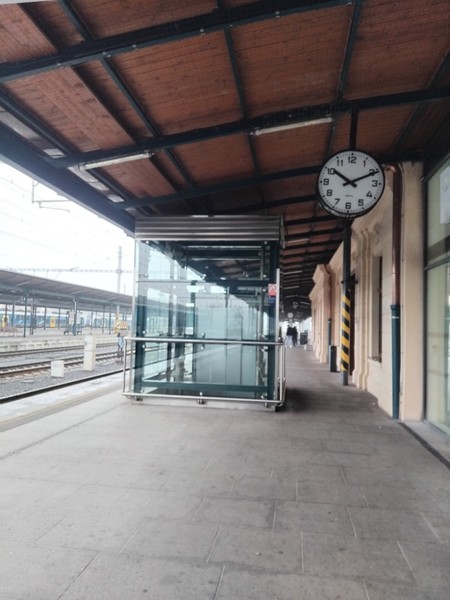 Přístupná kabina WC (dveře šířka 92 cm; kabina šířka 186 cm, hloubka 228 cm) je samostatná a nachází se v horní nádražní hale. Jednokřídlé dveře do WC jsou označené a otevírají se mechanicky směrem ven. Přístup k míse z pohledu od vstupu do kabiny je zleva. Prostor pro vozík vedle WC mísy je dostatečný (šířka 121 cm). Toaletní mísa je vybavena jedním sklopným a jedním pevným madlem. Kabina WC se uzamyká na Euroklíč.