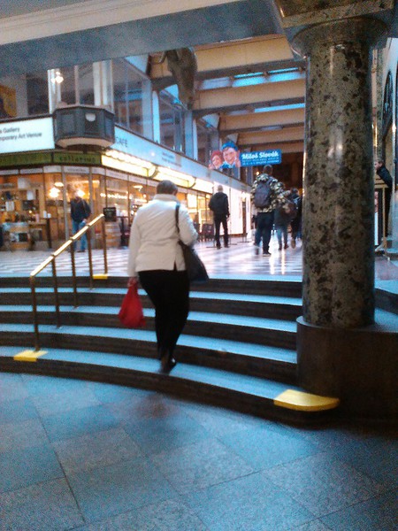 V horní úrovni pasáže je umístěna pokladna (pult výška 108 cm). Do samotného kina, které se nachází ve 2. patře, se vstupuje hlavním vchodem přes kavárnu Lucerna v 1. patře. Ke kavárně vede dominantní schodiště (+16, +2 schody). Vstupní dveře do kavárny jsou dvoukřídlé (hlavní křídlo šířka 90 cm, vedlejší křídlo šířka 70 cm), otevírají se mechanicky směrem ven.