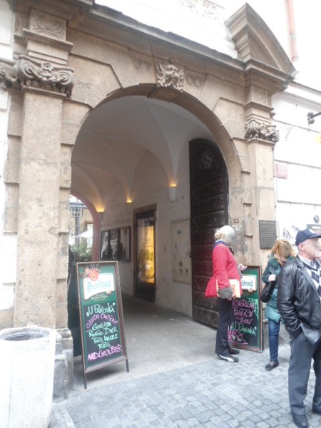 Vstup do divadla se nachází ve vnitobloku. Hlavní vstup je bariérový (+14, +3, +11 schodů). Hlavní vstupní dveře divadla v 1. patře nad schodištěm jsou dvoukřídlé (hlavní křídlo šířka 106 cm, vedlejší křídlo šířka 48 cm) a otevírají se mechanicky směrem ven. Zvonková signalizace u dveří chybí. Pod schodištěm vpravo (ve vnitrobloku) se nachází nepřístupná pokladna (+2 schody, pult výška 96 cm). Označený vedlejší vchod umožňující bezbariérový přístup je k dispozici v pasáži naproti pokladně vlevo. Zvonková signalizace (výška 136 cm, bez odsazení) je umístěna vpravo u dveří. Dveře vedlejšího vstupu jsou jednokřídlé (šířka 100 cm) a otevírají se mechanicky směrem ven.