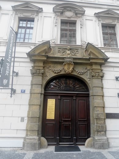 Za vstupem po levé straně se nachází částečně přístupná toaleta. Chodba rovně vede do dvora, ve kterém je vstup do bočního traktu přes +2 schody s dřevěnou prudkou rampou (sklon 21 %, šířka 79 cm, délka 137 cm) bez zarážek a madla. Vstupní jednokřídlé dveře (šířka 106 cm) se otevírají mechanicky směrem ven. U vstupních dveří vpravo je umístěna zvonková signalizace (výška 152 cm). Za vstupem se nachází služební výtah.