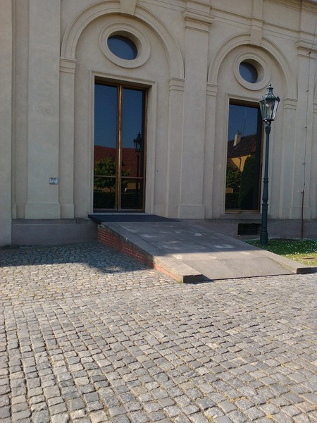 Přístupná samostatná toaleta (dveře šířka 80 cm; kabina šířka 170 cm, hloubka 172 cm) je součástí veřejných toalet na III. nádvoří Pražského hradu.