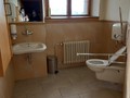 Přístupná toaleta (dveře šířka 80 cm; kabina šířka min. 180 cm, hloubka min. 180 cm) je samostatná a nachází se v přízemí za prodejní galerií. Jednokřídlé dveře do WC jsou označené a otevírají se mechanicky směrem ven. Přístup k míse z pohledu od vstupu do kabiny je zprava. Prostor pro vozík vedle WC mísy je dostatečný (šířka min. 130 cm). Toaletní mísa je vybavena dvěma sklopnými madly. Součástí kabiny je přebalovací pult. Kabina se uzamyká, klíč je k dispozici u pultu prodejní galerie.