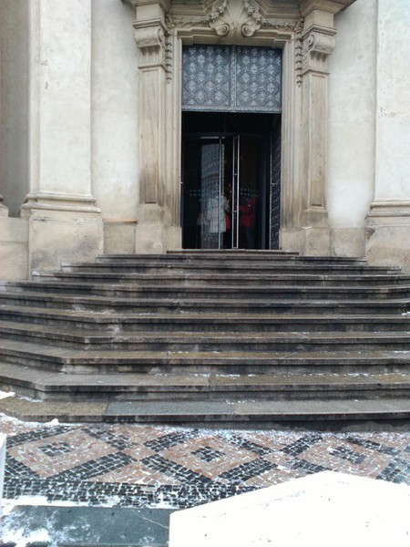 Kostel Sv. Mikuláše má vstup v horní části Malostranského náměstí, přístupová cesta má obtížný sklon (4-6,5 %) s nerovným povrchem z mozaikové dlažby. Před hlavním vstupem je +10, +1 schod, před výstupem je +9 schodů. Jako hlavní vstup se využívají dveře vpravo, vstupní dvoukřídlé dveře (šířka 2x 100 cm), otevírají se mechanicky směrem do zádveří (šířka 200 cm) nepravidelného tvaru. Do interiéru vedou dvoukřídlé dveře (šířka 2x91 cm), otevírají se směrem do zádveří.