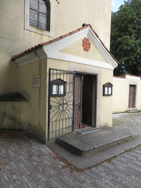 Před vstupem je +1 schod (výška 20 cm). Zvonková signalizace není k dispozici. Dvoukřídlé vstupní dveře (šířka 2x 58 cm) se otevírají mechanicky směrem dovnitř. Ze zádveří (šířka 180 cm, hloubka 200 cm) vedou do prostor kostela další dvoukřídlé dveře (šířka 2x 50 cm). Bezprostředně za dveřmi klesá -1 schod.