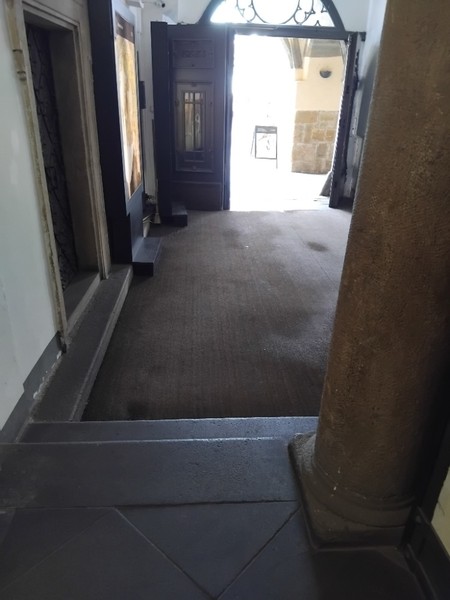 Vstup do budovy je z loubí. Přístupový chodník je široký a má rovný povrch z hrubší mozaikové dlažby. Široké dvoukřídlé dveře (šířka 2x 113 cm) se otevírají mechanicky směrem dovnitř. Ve dveřích je práh (výška 3 cm). Zvonková signalizace u vstupu není. Za vstupem je pasáž s pokladnou (pult výška 110 cm). Pasáž vede přes +2 schody k výtahu, před výtahem, který nemá dostatečné rozměry (viz Výtah), je další +1 schod.