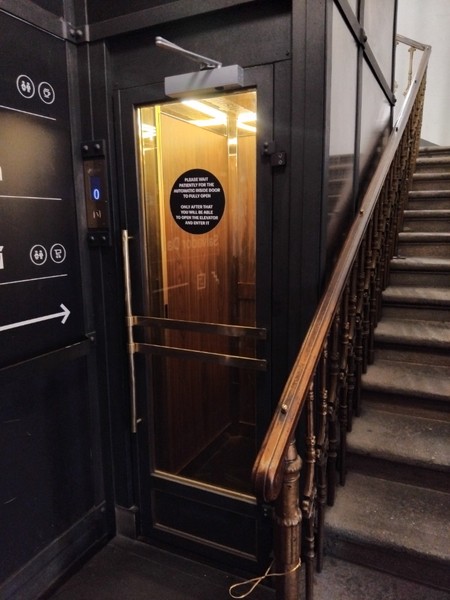 Výtah s nedostatečnými rozměry (mechanicky otevírané dveře šířka 60 cm; kabina šířka 70 cm, hloubka 95 cm) spojuje přízemí až 4. patro. V prostoru pře výtahem je +1 schod (výška 6 cm, hloubka 67 cm). V kabině není zrcadlo, madlo ani sedátko. Ovladač na nástupních místech je ve výšce max. 143 cm, maximální výška ovladačů uvnitř kabiny je 128 cm.