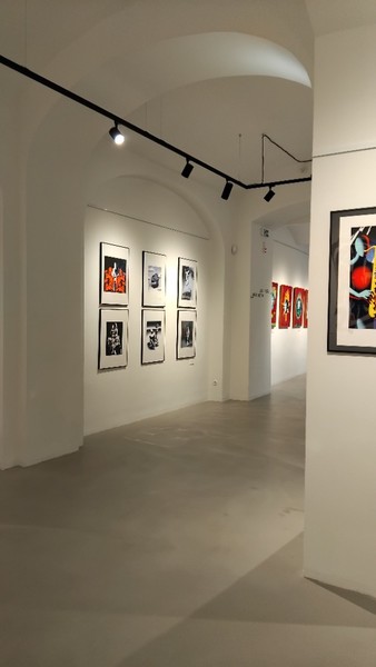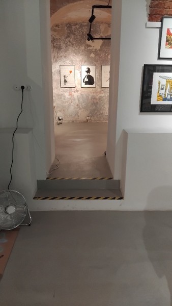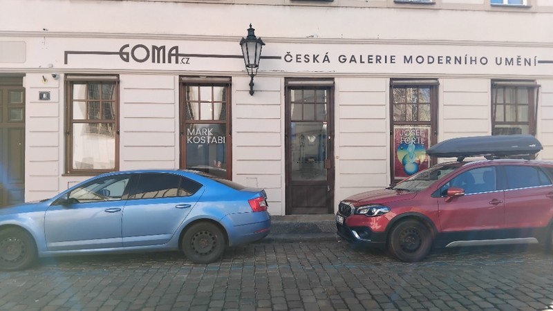 Galerie se nachází v historickém centru Prahy, v okolí se často vyskytuje hrubá kamenná dlažba. Chodník před budovou má povrch z rovné mozaikové dlažby. Před vstupem je +1 schod (výška 15 cm). Jednokřídlé dveře (šířka 95 cm) se otevírají mechanicky směrem dovnitř. Zvonková signalizace (výška 149 cm) je vlevo u dveří. Za vstupem je další +1 schod (výška 18 cm).