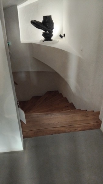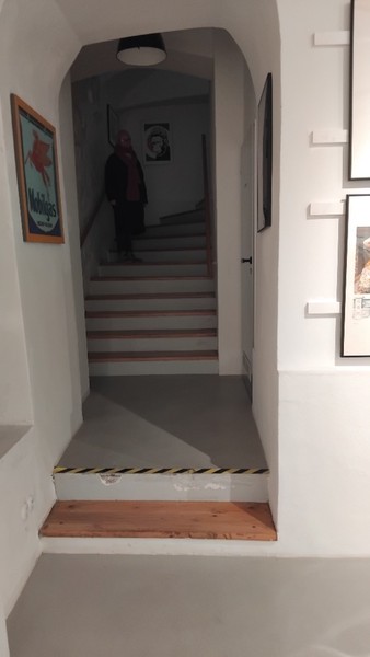 Výstavní prostory se nacházejí v přízemí (v úrovni vstupní haly bez dalšího převýšení) a v suterénu. Podlaží jsou propojená pouze úzkým, částečně točitým schodištěm (-21 a -2 schody). Manipulační prostor v interiéru je dostatečný, průchody jsou široké min. 80 cm.