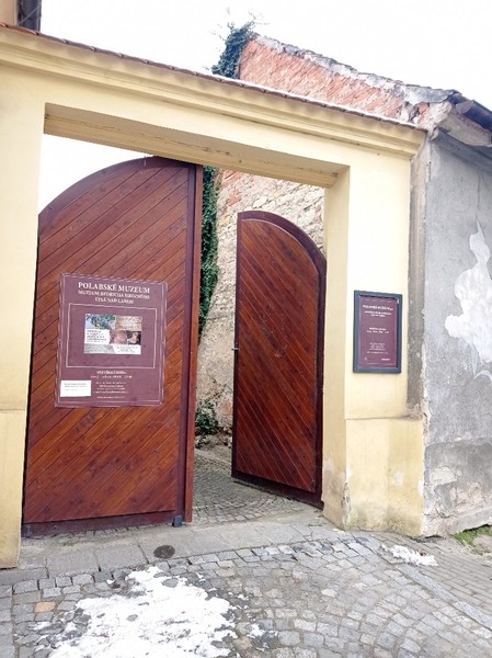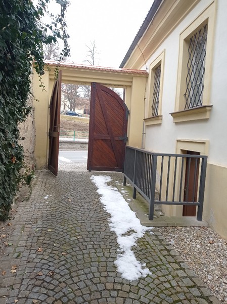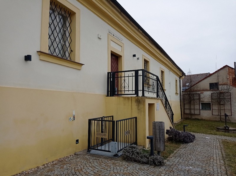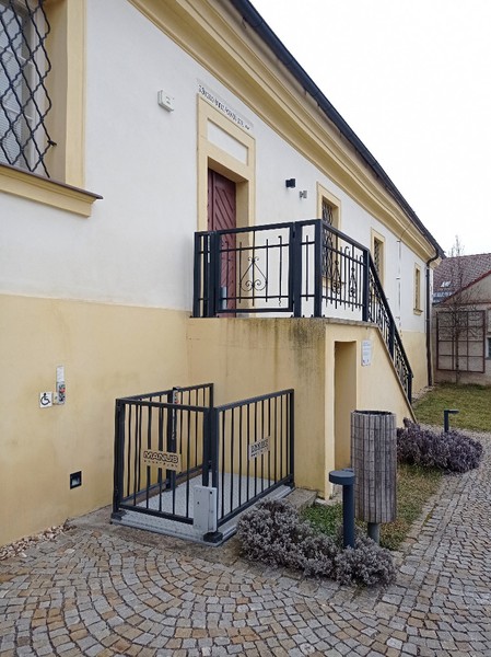 Pro návštěvníky je určený vchod zadním traktem, ke kterému vede podél budovy chodník s hrubší dlažbou a podélným sklonem (sklon max. 5 %). Před vstupem je schodiště (+12 schodů), které kompenzuje svislá zdvihací plošina (nosnost 400 kg; rozměry přepravní plochy šířka 87 cm, hloubka 145 cm). U plošiny je k dispozici zvonková signalizace (výška 100 cm). Horní podesta je dostatečná. Dvoukřídlé dveře (šířka 2x 60 cm) se otevírají směrem dovnitř. Vpravo za vstupem je pokladna. Vstup vede do vnitřního dvora, z nějž je dále přístup do expozice (dveře šířka 2x 60 cm).