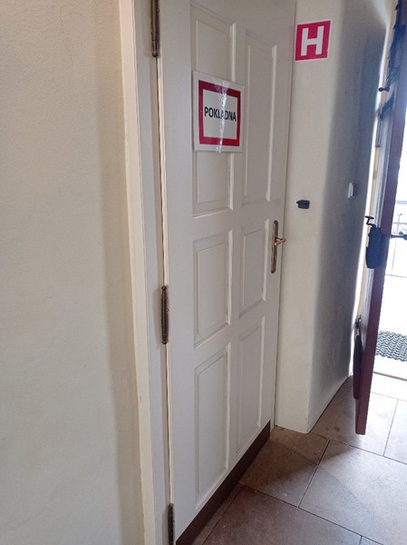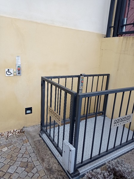 Výtah není k dispozici, přístup do zvýšeného přízemí je řešen svislou zdvihací plošinou (viz Vstup).