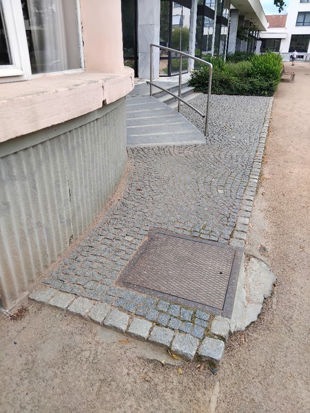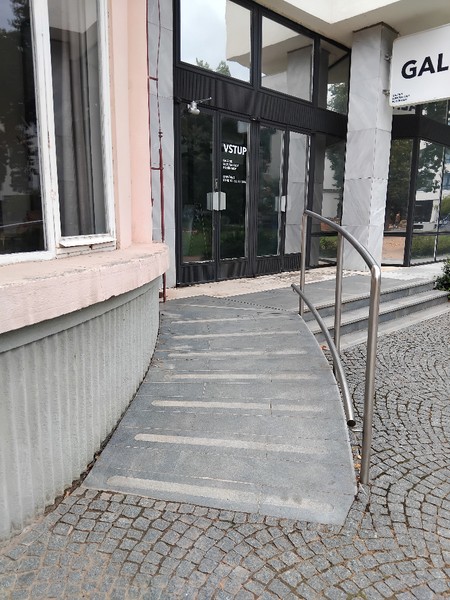Přístupová cesta má povrch z kvalitního maltu. Před vstupem jsou +2 schody, které kompenzuje rampa (sklon 15-16 %, šířka 128 cm, délka 240 cm) s jednostranným madlem (výška 106 cm). Na styku ploch pod rampou je malé převýšení (výška 3-4 cm).