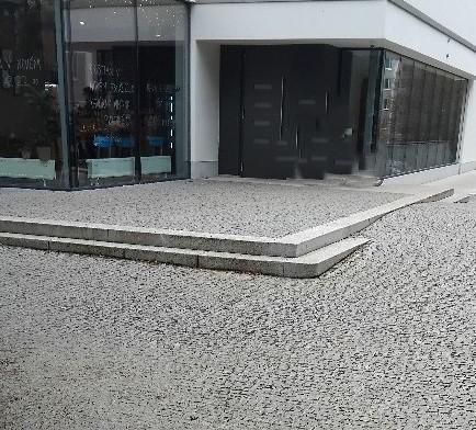 Upravená kabina WC (dveře šířka 80 cm; kabina šířka 230 cm, hloubka 220 cm) je součástí kavárny. Jednokřídlé dveře do WC jsou označené a otevírají se mechanicky směrem ven. Přístup k míse z pohledu od vstupu do kabiny je zprava. Prostor pro vozík vedle WC mísy (šířka 172 cm) je dostatený. Toaletní mísa je vybavena jedním sklopným a jedním pevným madlem.