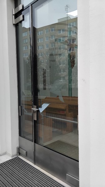 Kavárna ma samostatný vstup z východní strany. Dvoukřídlé dveře (hlavní křídlo šířka 90 cm, vedlejší křídlo šířka 40 cm) se otevírají mechanicky směrem ven.