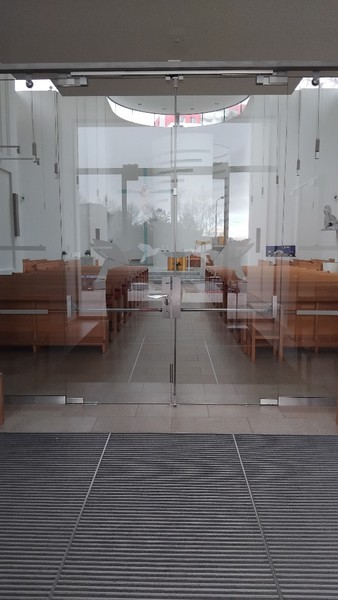 Vedlejší vstup je k dispozici z boku. Na severní straně, vlevo od vstupu hlavního, jsou vstupní dveře (šířka 90 cm) do výtahu, který propojuje uliční úroveň s chrámovým předsálím ve zvýšeném přízemí, kůrem i komunitním centrem v polozapuštěném suterénu.