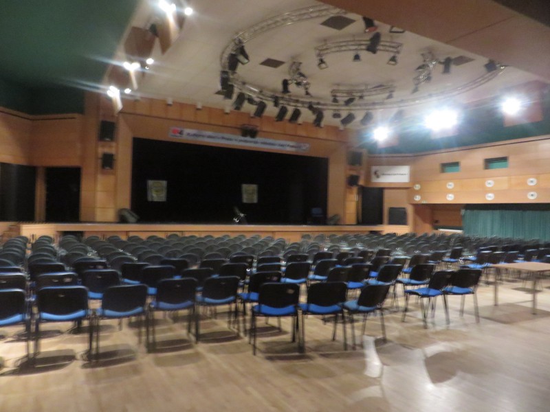 Za vstupem je k dispozici recepce s pokladnou (pult výška 111 cm) a šatna (pult výška 90 cm). V přízemí se nachází uzamčená upravená toaleta a velký sál s dvoukřídlými dveřmi (hlavní křídlo šířka 81 cm, vedlejší křídlo šířka 71 cm). Sál je vybaven mobilními židlemi, manipulační prostor je dostatečný.