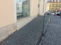Komunikace v okolí objektu má místy obtížnou kombinaci podélného (4 – 6 %) a příčného (4 %) sklonu. Před vstupem jsou +3 schody, které vyrovnává přímá rampa (sklon 8 %, šířka 142 cm, délka 489 cm) s oboustranným madlem (výška 103 cm). Jednokřídlé vstupní dveře (šířka 85 cm) se otevírají mechanicky směrem ven. Zvonková signalizace (výška 154 cm) je umístěna vpravo. Část podlahy za dveřmi (v délce 2 m) je ve sklonu (8 %).