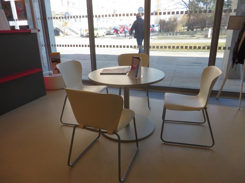 Vstup do kulturního centra tvoří karuselové dveře (průměr 180 cm), doplněné uzamčenými jednokřídlými dveřmi (šířka 99 cm). Zvonková signalizace pro přivolání personálu (výška 112 cm) je k dispozici vpravo u dveří.