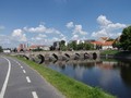 Most s replikami barokních soch a kříže, postavený v gotickém slohu, překlenuje řeku Otavu.