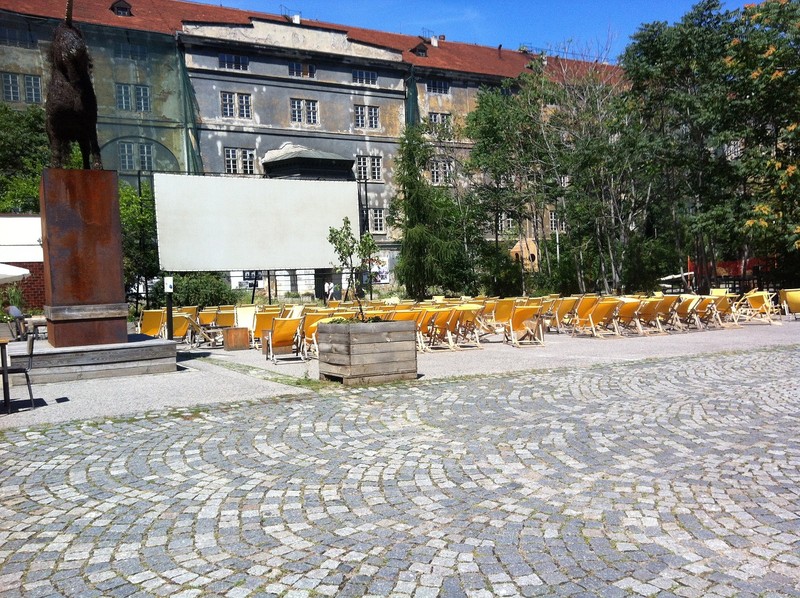 Povrch prostorného dvora (vnitrobloku) tvoří převážně hrubší dlažba. Centrálně umístěná plocha s letním kinem má rovný betonový povrch. Část dvora s dřevěnou terasou je zvýšená.