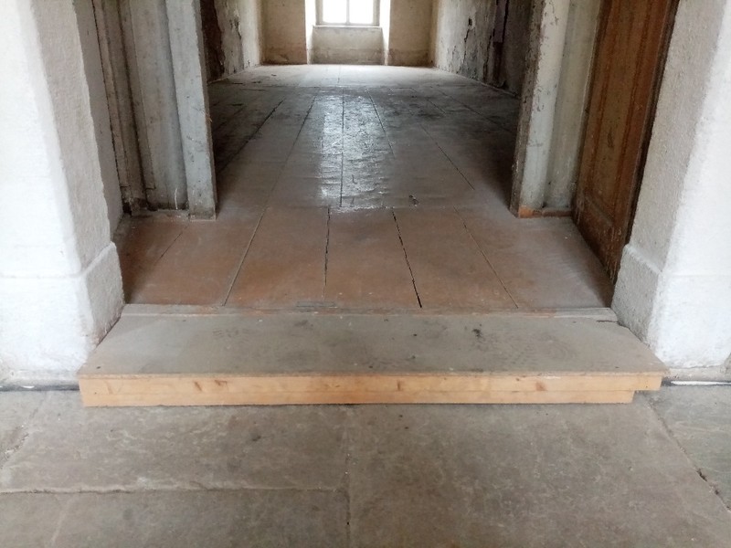 Ve dveřích do kaple je vyšší kamenný práh (výška 4-5 cm) a ve vstupu do kuchyně +1 schod (výška 8 cm), který se bude nahrazovat nájezdem.