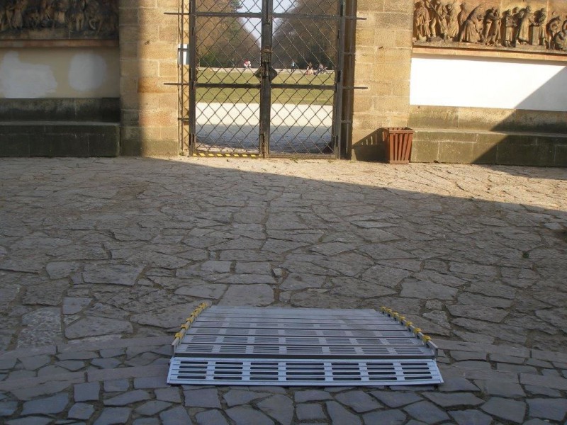 Před hlavním vstupem do letohrádku jsou +2 schody, které kompenzuje mobilní rampa (sklon 28 %, šířka 88 cm, délka 150 cm) použitelná za asistence personálu.