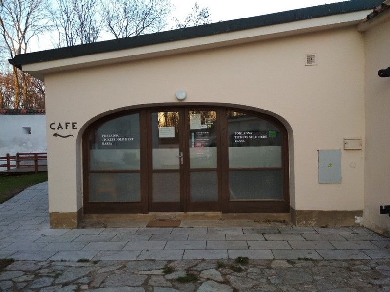Po pravé straně je provozní domek s pokladnou (pult výška 75 cm), prodejnou, občerstvením a hygienickým zázemím. Dvoukřídlé vstupní dveře do pokladny (šířka 2x 69 cm) s +1 schodem (výška 16 cm) se otevírají mechanicky směrem dovnitř. Otevřít lze pouze levé křídlo dveří. Od vstupu do pokladny vede chodník (šířka 150 cm – 200 cm) s rovnou dlažbou a místním sklonem (max. 7,5 %) ke vstupu do občerstvení (dveře šířka 100 cm, pult výška 121 cm). Oddělený vstup má i hygienické zázemí za občerstvením.